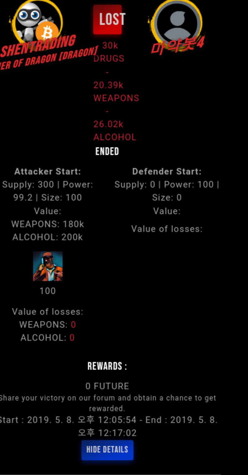 Check my latest fight ! shentrading vs 마약봇4snuff4 (51)in #drugwars-fight • 7 years ago #gaming #fight #dw