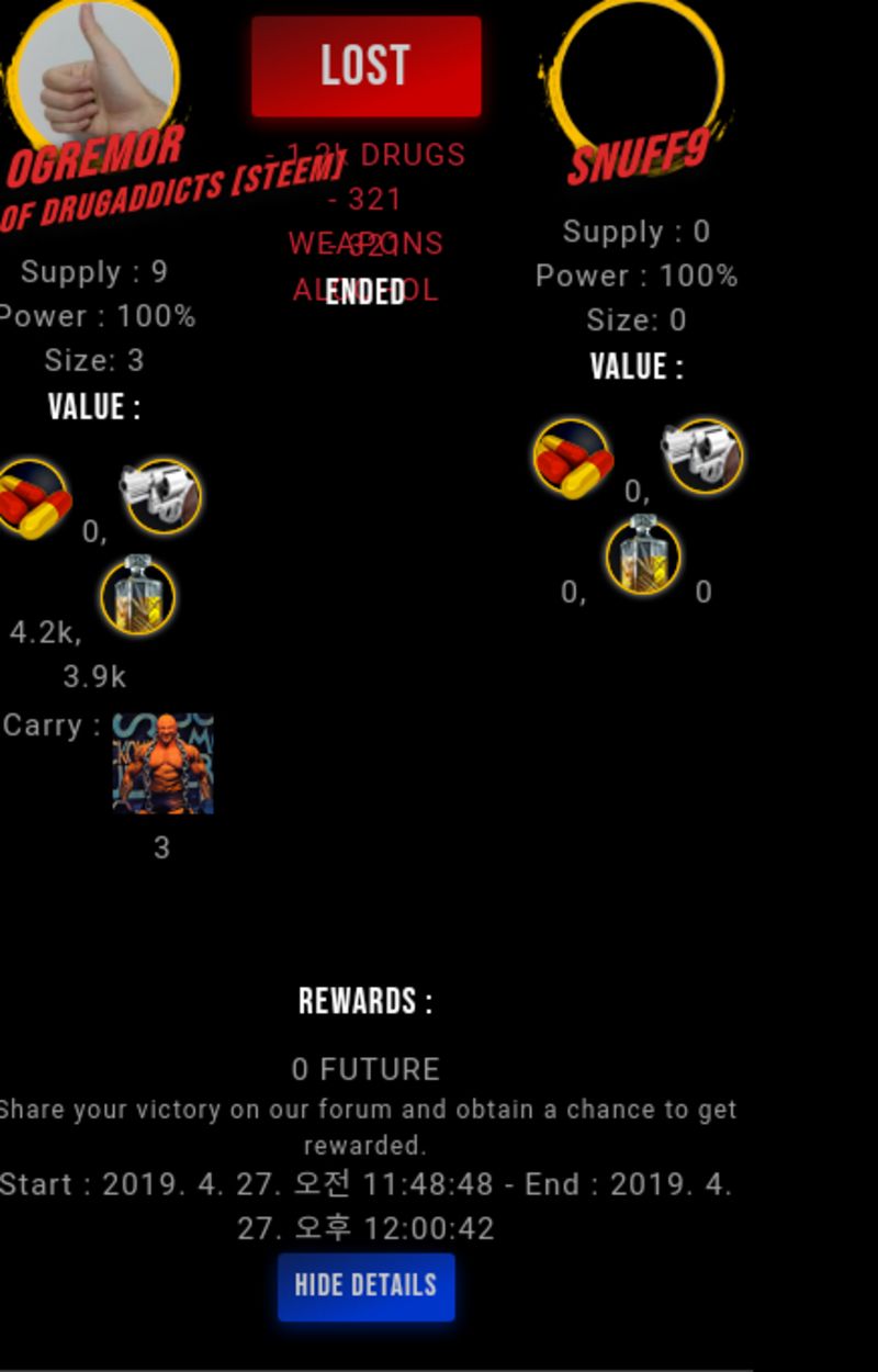 Congratulations @snuff9 ! Your fight received an upvote of 1.5% from the King Dealer as incentive for your activity and as a gratitude for your support to the game.