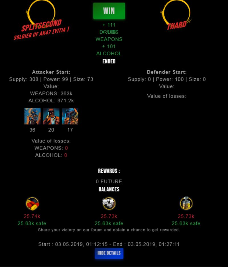 Congratulations @splitsecond ! Your fight received an upvote of 2.5% from the King Dealer as incentive for your activity and as a gratitude for your support to the game.