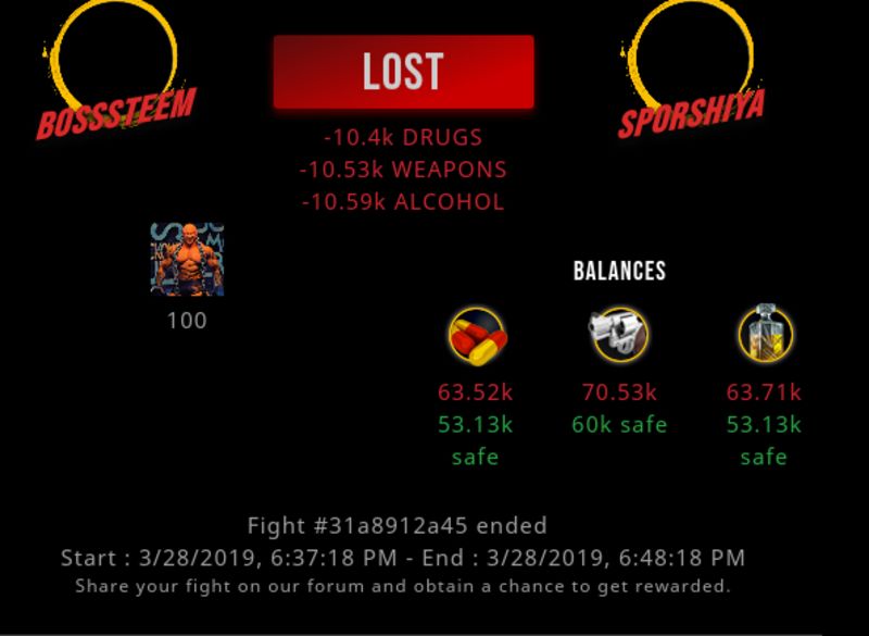 Check my latest fight ! bosssteem vs sporshiyasporshiya (48)in #drugwars-fight • 7 years ago #gaming #fight #dw