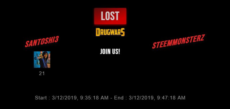 Check my latest fight ! santoshi3 vs steemmonsterzsteemmonsterz (25)in #drugwars-fight • 7 years ago #gaming #fight #dw