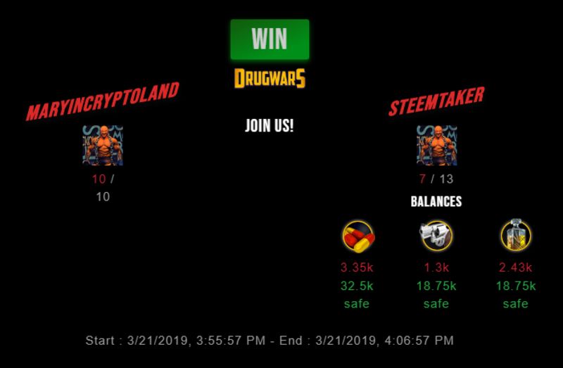 Check my latest fight ! maryincryptoland vs steemtakersteemtaker (43)in #drugwars-fight • 7 years ago #gaming #fight #dw