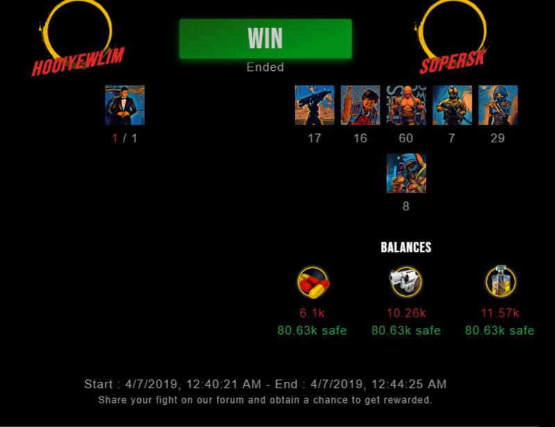 Congratulations @supersk ! Your fight received an upvote of 1.3% from the King Dealer as incentive for your activity and as a gratitude for your support to the game.