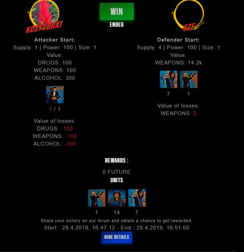 Congratulations @szf ! Your fight received an upvote of 6% from the Dealer as incentive for your activity and as a gratitude for your support to the game. Want to know more about DrugWars.io?