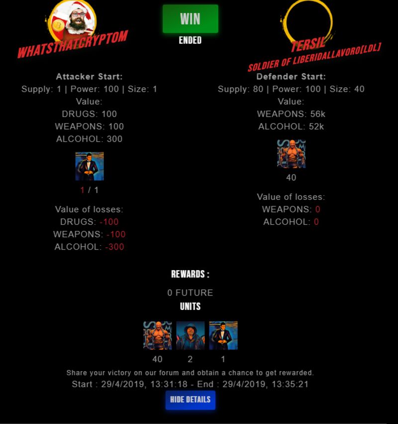 Congratulations @tersil ! Your fight received an upvote of 0.9% from the King Dealer as incentive for your activity and as a gratitude for your support to the game.