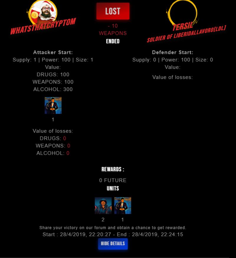 Congratulations @tersil ! Your fight received an upvote of 0.9% from the King Dealer as incentive for your activity and as a gratitude for your support to the game.