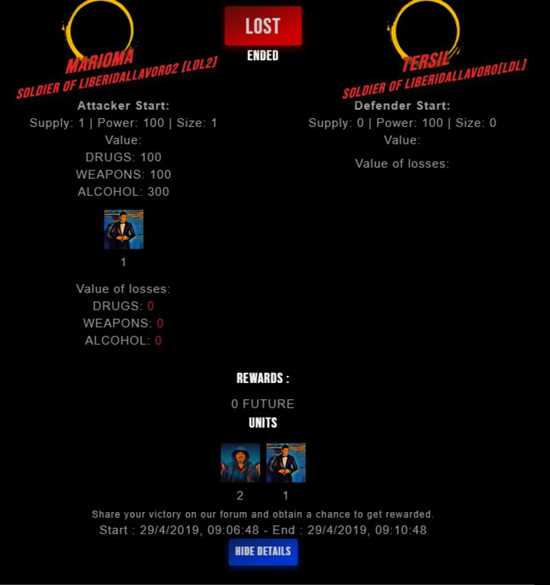 Congratulations @tersil ! Your fight received an upvote of 0.9% from the King Dealer as incentive for your activity and as a gratitude for your support to the game.