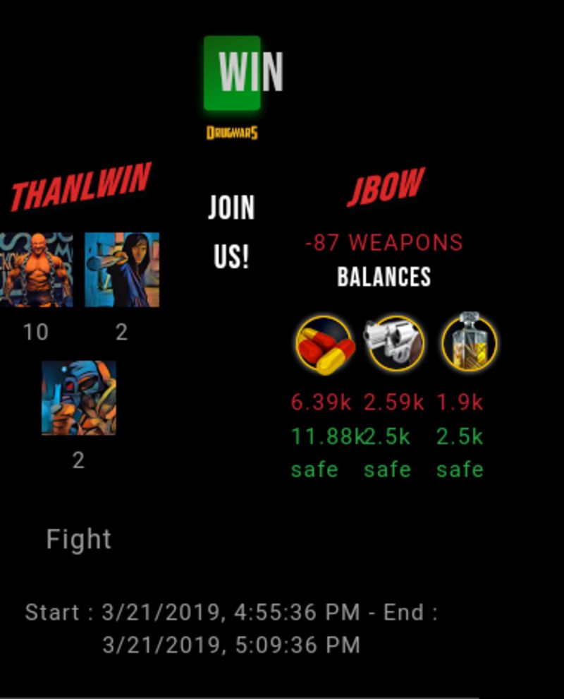Check my latest fight ! thanlwin vs jbowthanlwin (43)in #drugwars-fight • 7 years ago #gaming #fight #dw