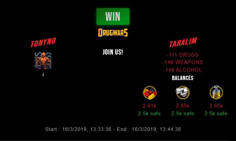 Check my latest fight ! tonyno vs taralimtonyno (36)in #drugwars-fight • 7 years ago #gaming #fight #dw