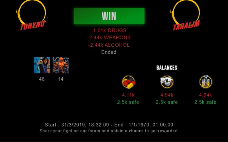 Check my latest fight ! tonyno vs taralimtonyno (36)in #drugwars-fight • 7 years ago #gaming #fight #dw