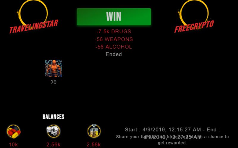 Check my latest fight ! travelingstar vs freecryptotravelingstar (40)in #drugwars-fight • 7 years ago #gaming #fight #dw