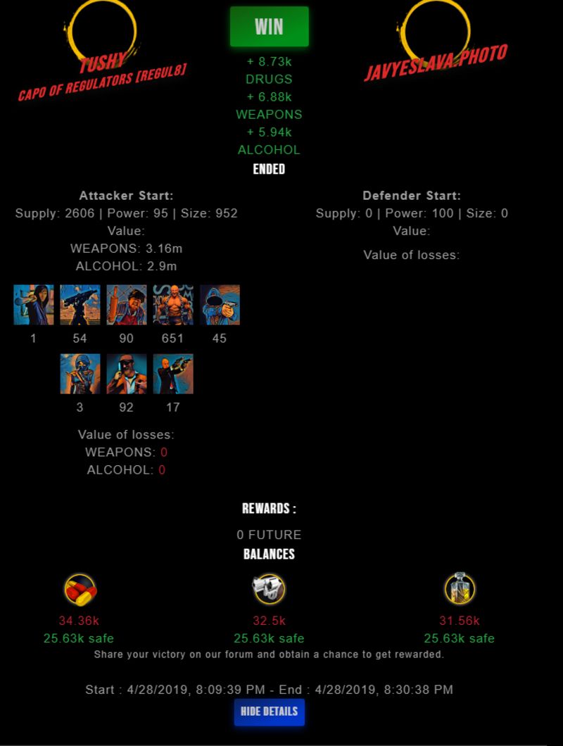 Congratulations @tushy ! Your fight received an upvote of 3.7% from the King Dealer as incentive for your activity and as a gratitude for your support to the game.