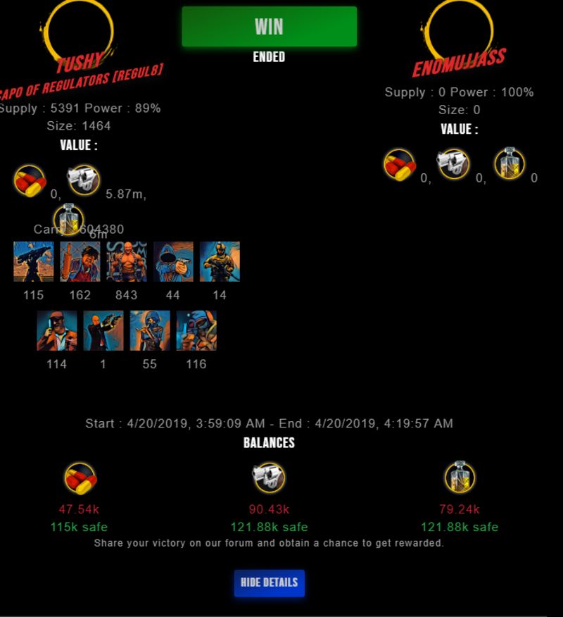 Congratulations @tushy ! Your fight received an upvote of 3.7% from the King Dealer as incentive for your activity and as a gratitude for your support to the game.