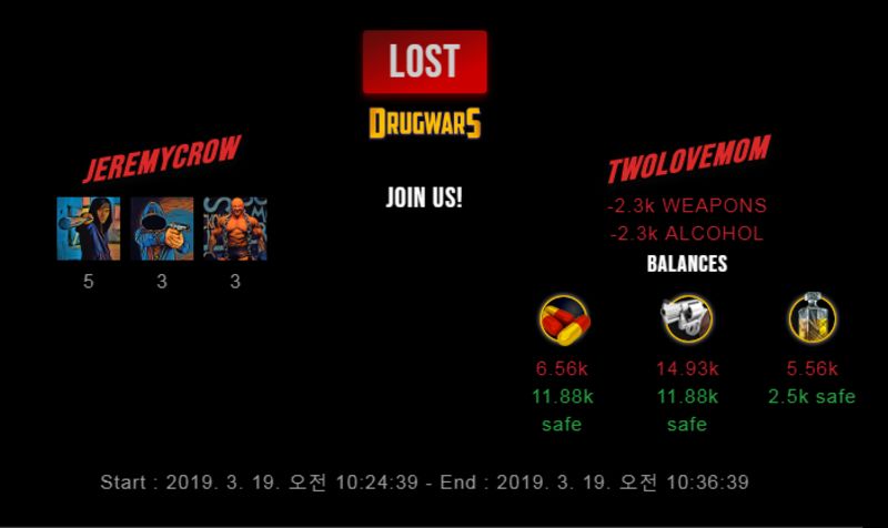 Check my latest fight ! jeremycrow vs twolovemomtwolovemom (35)in #drugwars-fight • 7 years ago #gaming #fight #dw