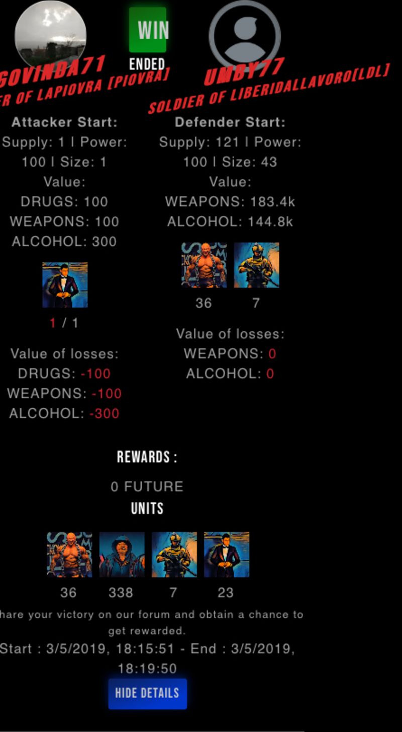 Check my latest fight ! govinda71 vs umby77umby77 (44)in #drugwars-fight • 7 years ago #gaming #fight #dw