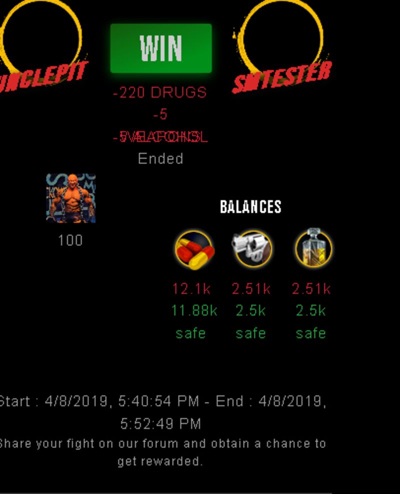 Check my latest fight ! unclepit vs smtesterunclepit (35)in #drugwars-fight • 7 years ago #gaming #fight #dw