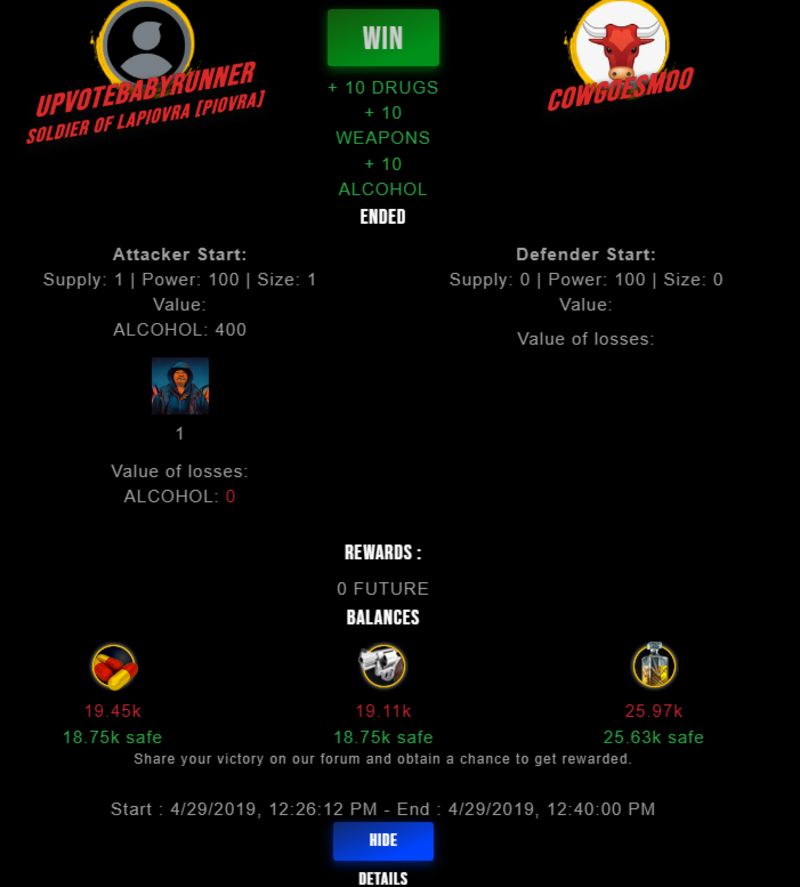 Congratulations @upvotebabyrunner ! Your fight received an upvote of 0.6% from the King Dealer as incentive for your activity and as a gratitude for your support to the game.