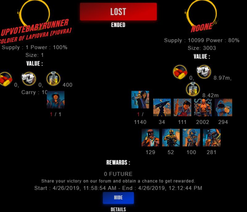 Check my latest fight ! upvotebabyrunner vs nooneupvotebabyrunner (44)in #drugwars-fight • 7 years ago #gaming #fight #dw