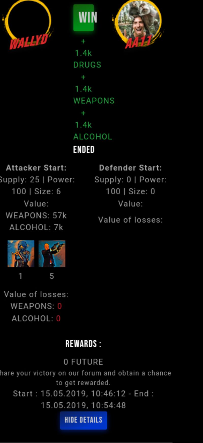 Congratulations @wallyd ! Your fight received an upvote of 12% from the Dealer as incentive for your activity and as a gratitude for your support to the game. Want to know more about DrugWars.io?