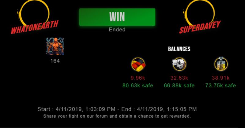 Congratulations @whatonearth ! Your fight received an upvote of 2.2% from the King Dealer as incentive for your activity and as a gratitude for your support to the game.