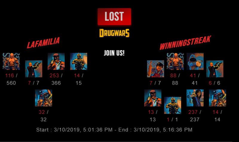 Check my latest fight ! lafamilia vs winningstreakwinningstreak (41)in #drugwars-fight • 7 years ago #gaming #fight #dw