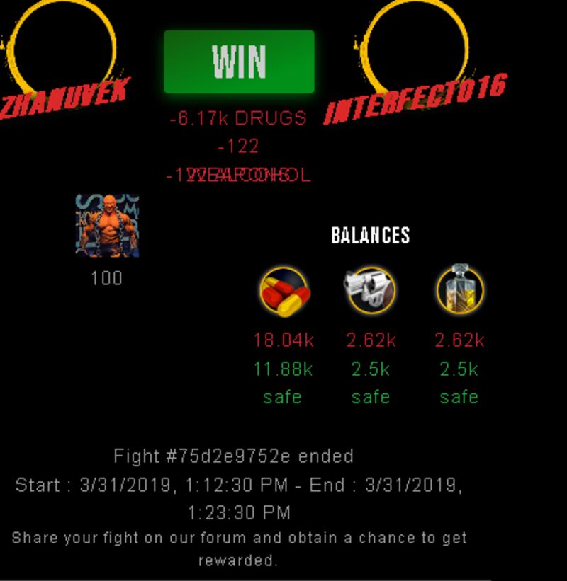 Check my latest fight ! zhanuvek vs interfecto16zhanuvek (35)in #drugwars-fight • 7 years ago #gaming #fight #dw