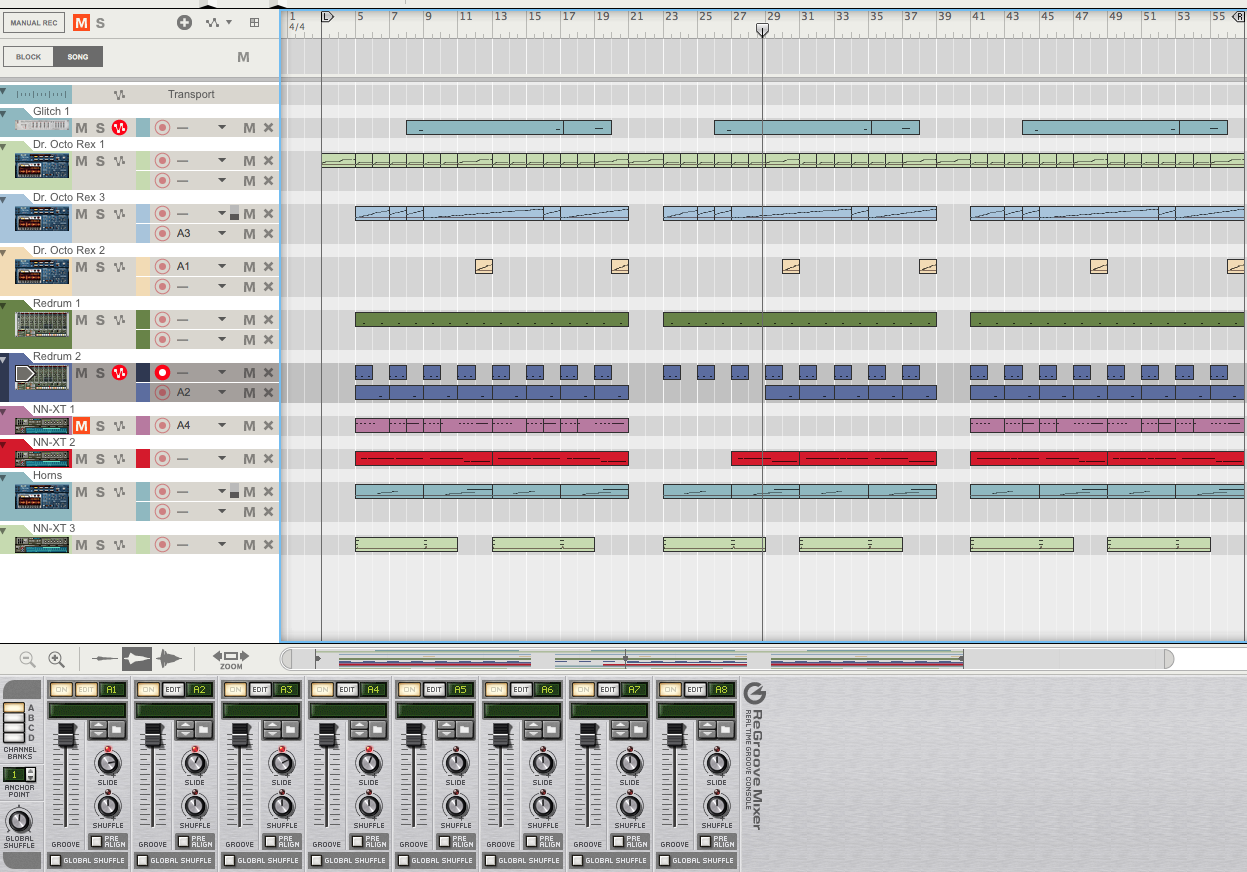 Heres a pic of the sequencer from reason showing the arrangement. On the bottom is the groove panel which gives the beat that swing i need.