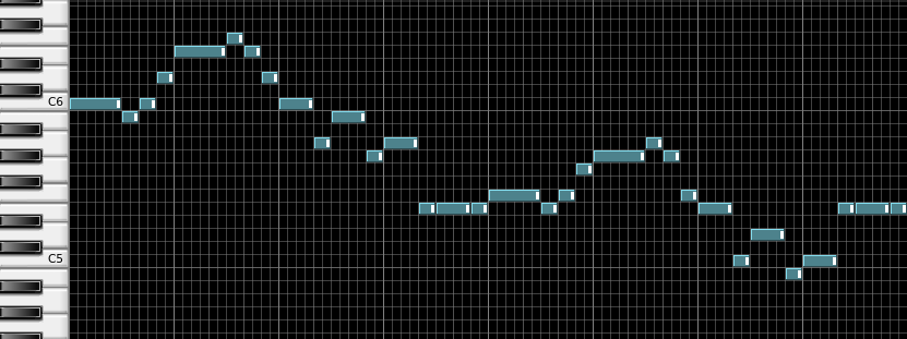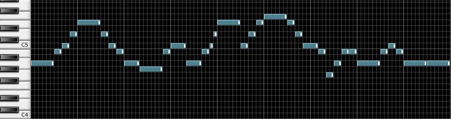 Aqui podemos observar las dos primeras frases de la melodia principal (la cual es tocada por un piano), en la cual solo se utiliza el I, VI y VII grado.