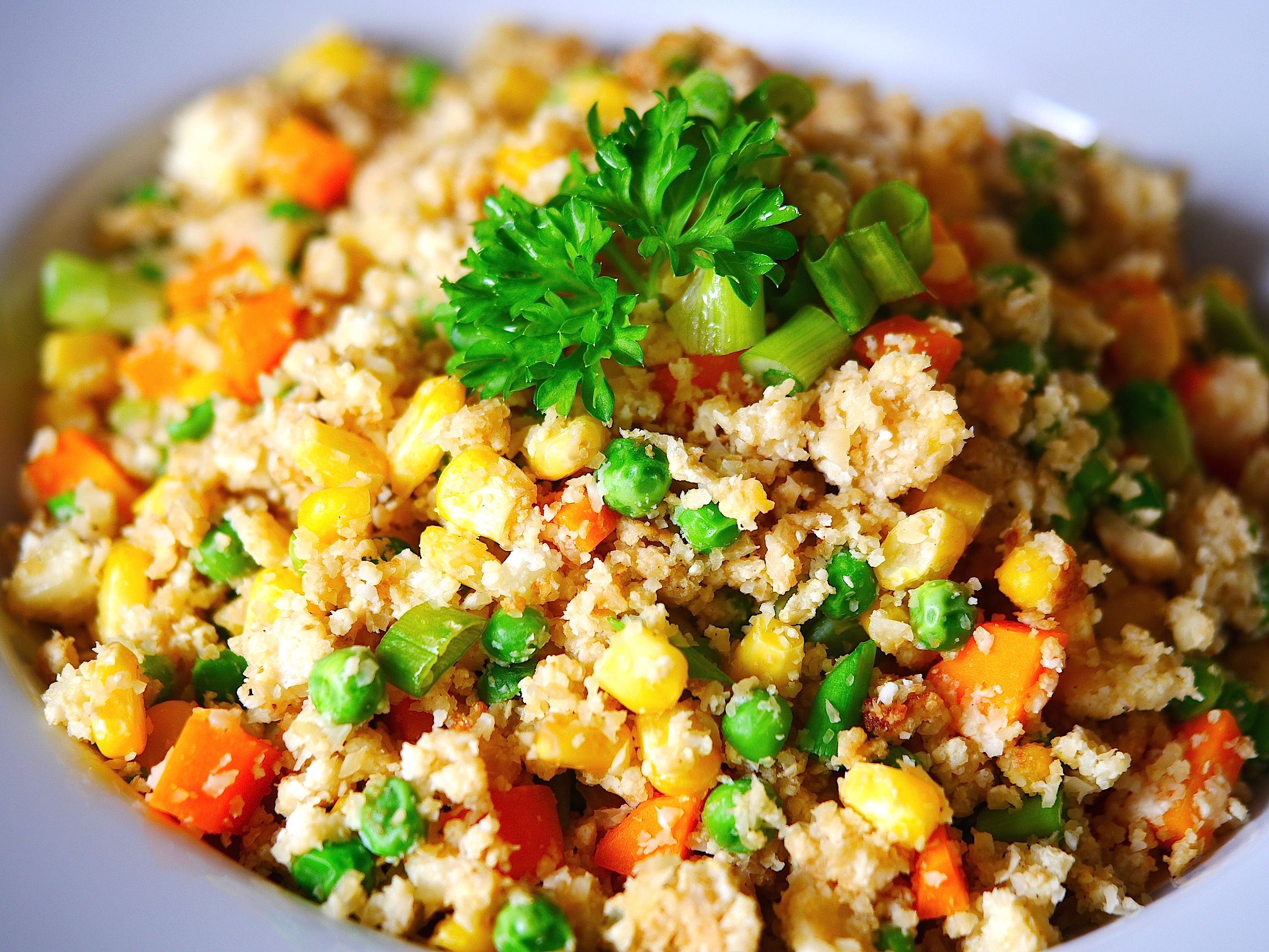 Do you like Chinese food but want a healthier version? This is a low-carb option for those who want all the flavor of Chinese fried rice but none of the guilt. Serves 2-3 people. As a fried rice look-alike, this dish can hold its own. The cauliflower is chewy and nubbly in all the right rice-like ways. Bits of egg and tender vegetables also make it a satisfying meal on its own. This still feels like comfort food to me — just comfort food that's sneaking a few more vegetables into my day!