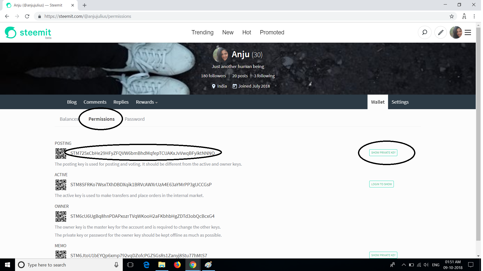 അതിൽ ക്ലിക്ക് ചെയ്യുമ്പോൾ നിങ്ങളുടെ അക്കൗണ്ടിലെ സ്റ്റീമിന്റെ കണക്കു കാണാൻ സാധിക്കും. ആ പേജിൽ മുകളിൽ "permissions" എന്നൊരു സെക്ഷൻ കാണാൻ സാധിക്കും. അതിൽ ക്ലിക്ക് ചെയ്യുമ്പോൾ, ഒരുപാടു പാസ്സ്റോഡ് കീയുകൾ ഉള്ള ഒരു പേജ് തുറന്നു വരും. ഇതിൽ ആദ്യത്തെ കീ ആണ് "പ്രൈവറ്റ് പോസ്റ്റിങ്ങ് കീ ". ഈ പേജ് തുറന്നു വരുമ്പോൾ കാണുന്ന കീ അല്ല കോപ്പി ചെയ്യേണ്ടത്. "Posting" എന്ന് എഴുതിയതിന്റെ വലത് ഭാഗത്തു ഒരു ബോക്സിൽ "show private key " എന്ന് എഴുതി കാണലും. അവിടെ ക്ലിക്ക് ചെയ്യുമ്പോൾ വാങ്ങുന്ന പാസ്സ്വേർഡ് ആണ് കോപ്പി ചെയ്യേണ്ടത്.