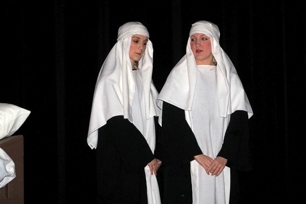 The funniest thing about this all... is my costume change between being a nun and a prostitue. I was "Prostitue #1" which meant I was the leading lady in that scene. The funny thing is that I was playing a nun in the scene right before hand, and so I literally had my prostitute costume on underneath my habit and literally had to run backstage... tear it off... and run back on stage.