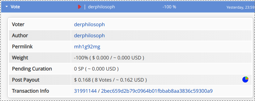 Ich muss dazu sagen, dass bei einem "Downvote" der Betrag dem Rewardpool zurückgeführt wird, Du als "Flagger" bekommst weder eine Belohnung noch Curation-Rewards.