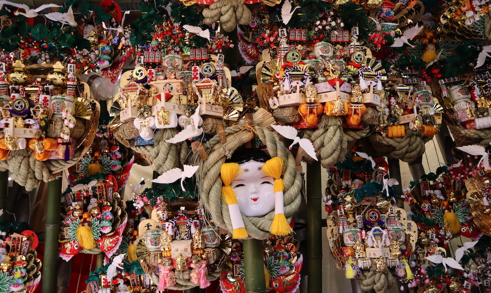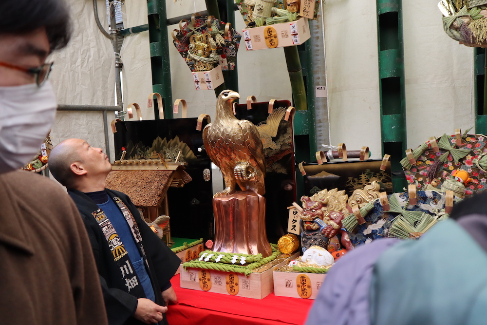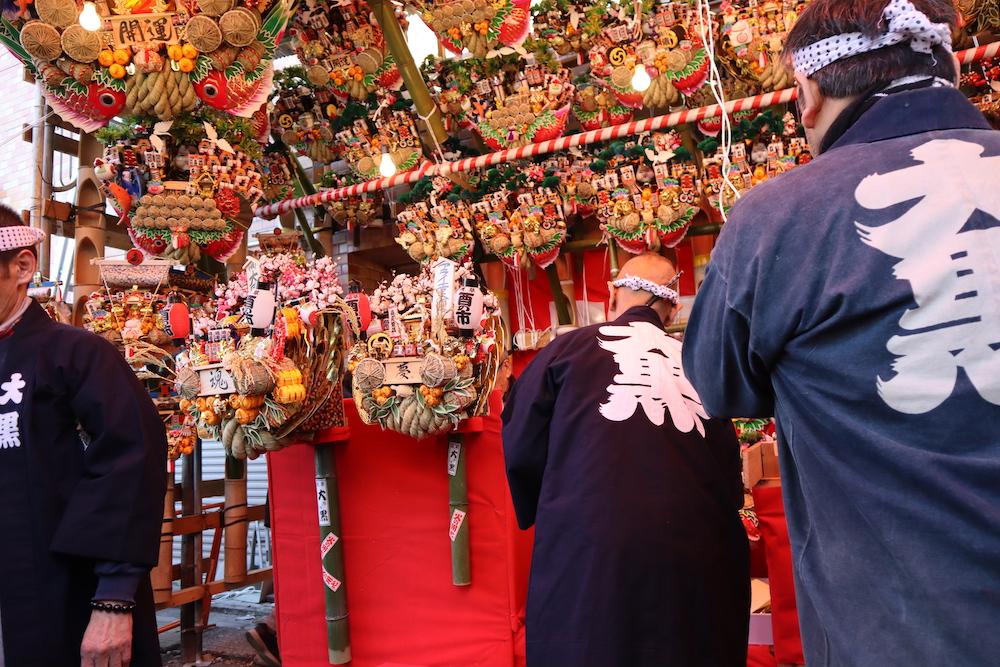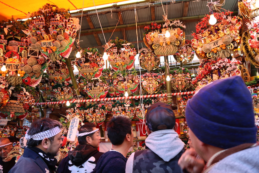 The tradition is to buy an amulet ( Kumade )which is said to bring commercial good luck and happiness into ones life. The interesting thing with this tradition is that the buyers of the amulet form a relationship with the seller and then buy a small Kumade. They return the following year to the same seller and buy a bigger Kumade and give the older one to the sellers. ( I think they burn them after , who knows, maybe they re-use the parts )