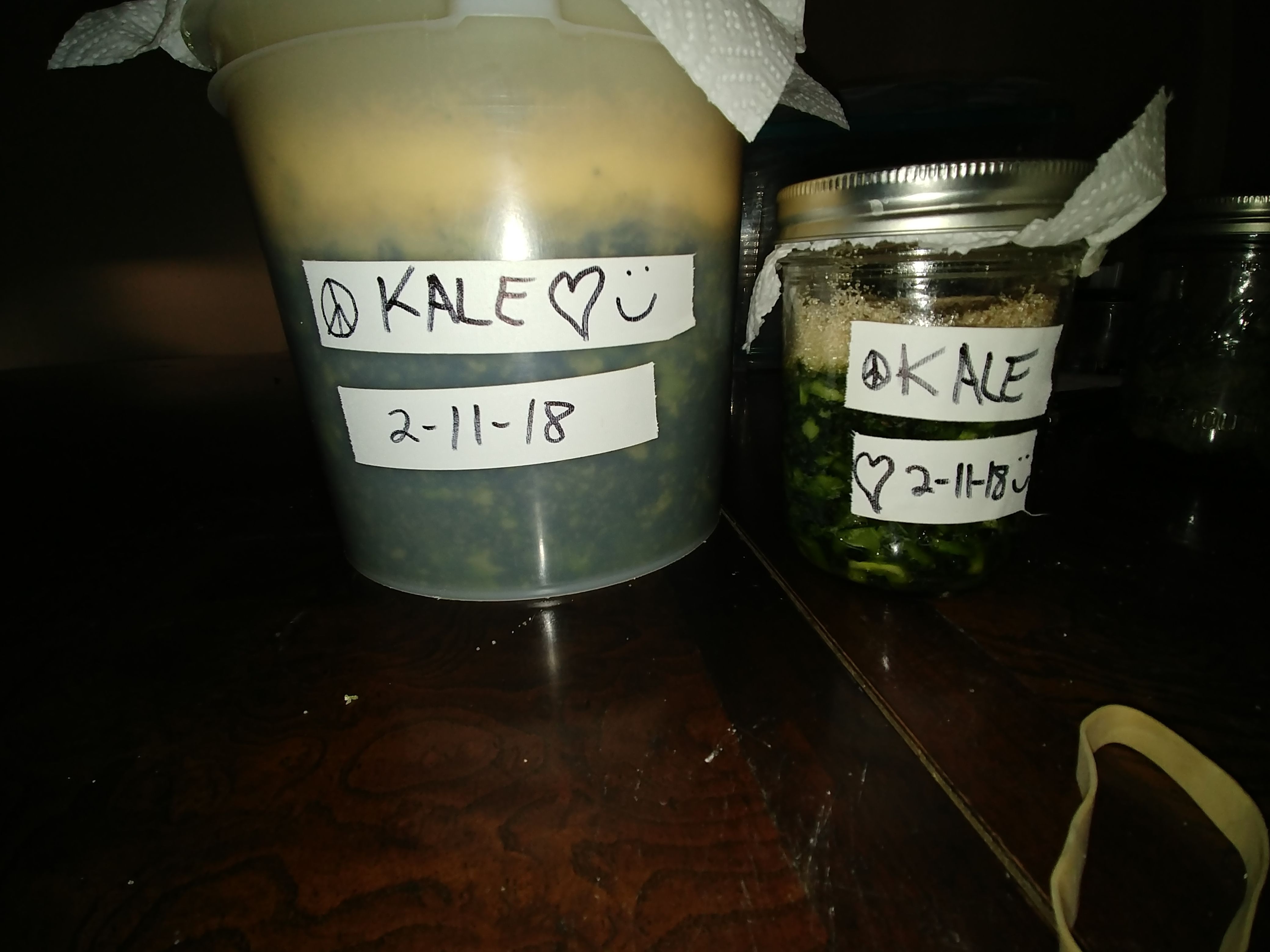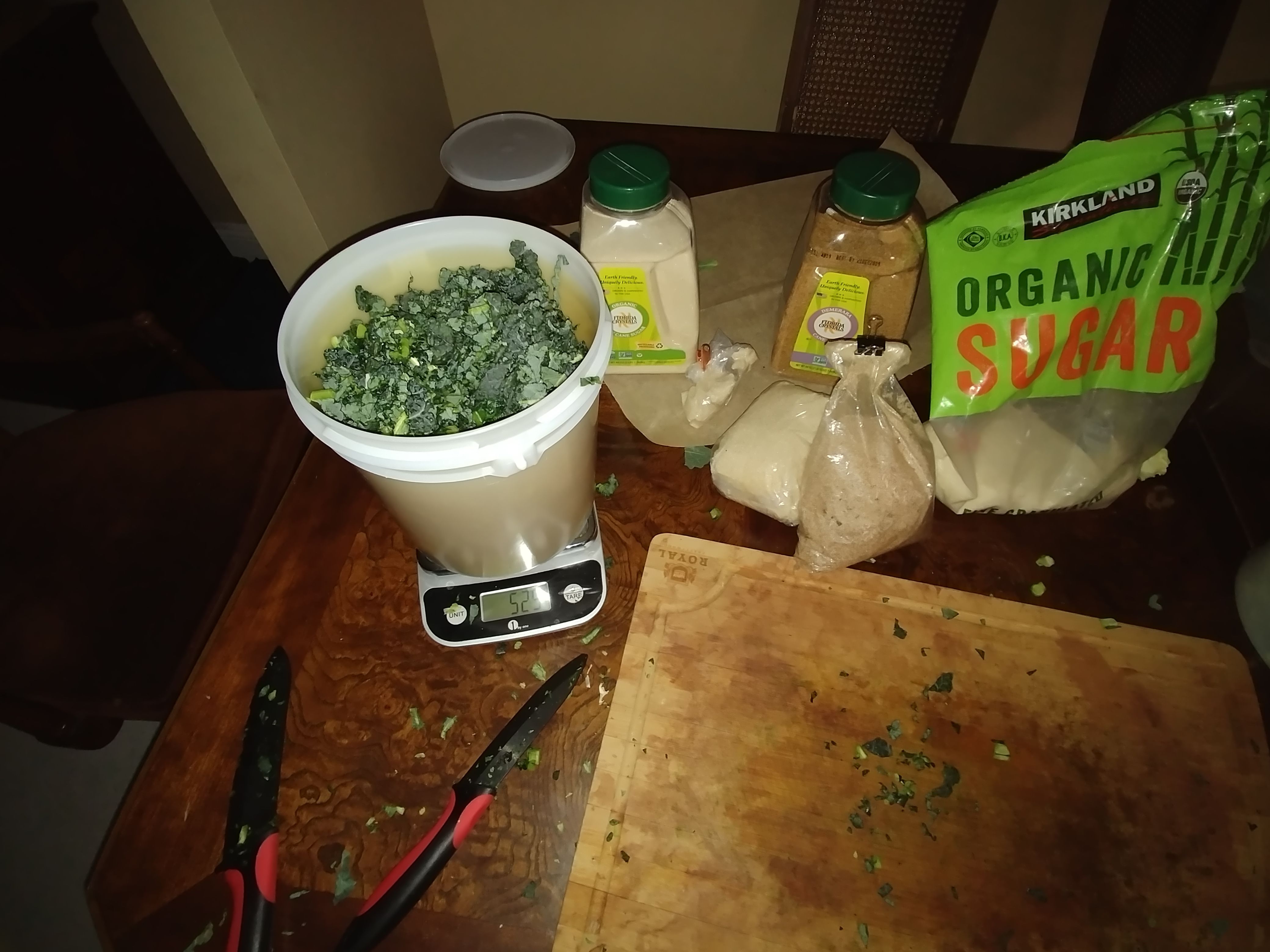 I then mixed with the plant material equal-weight sugar. I mix gently and I tightly squeezed all the plant material after thoroughly mixed with the sugar into the one gallon container we had. Glass or PPE plastic is fine. I then put a 2-inch sugar cap on the kale ferments I needed a smaller jar to fit it all.