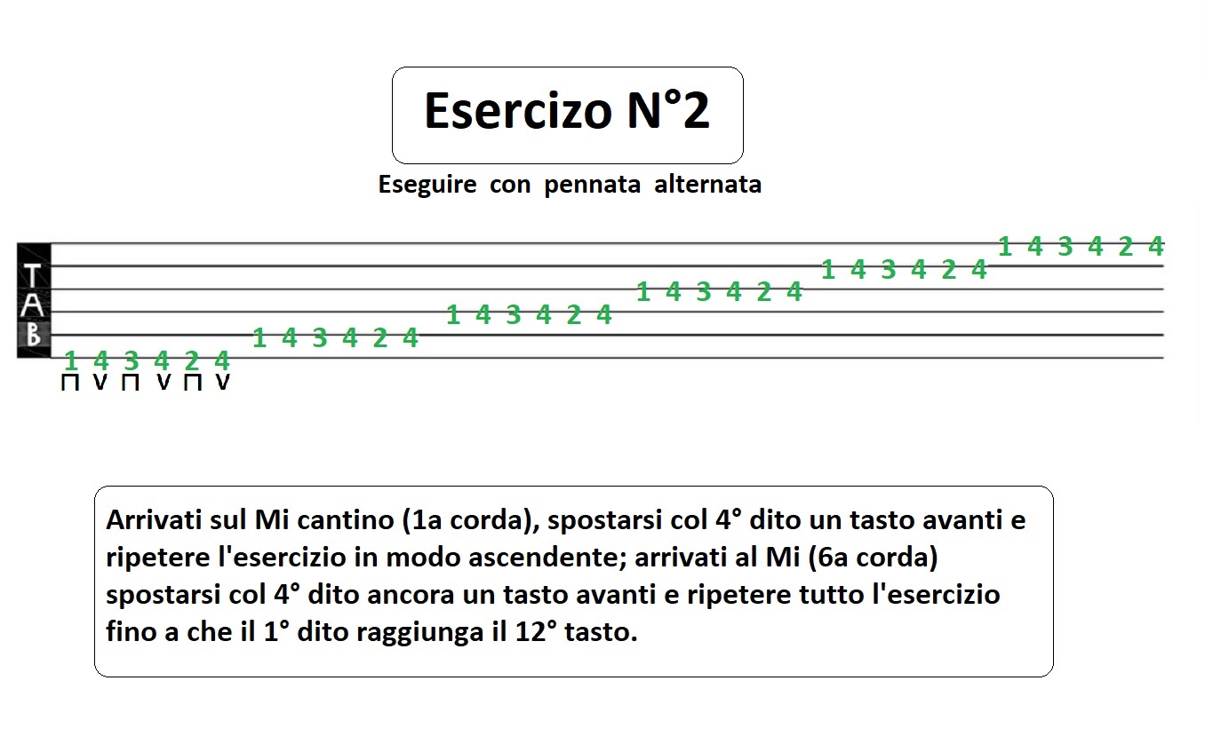Per cominciare a prendere dimestichezza col manico, tastiera, corde e plettro ecco qui di seguito dei semplici esercizi da fare su tutte e sei le corde e su tutti i tasti, arrivando al dodicesimo torniamo indietro seguendo sempre la logica dell'esercizio.