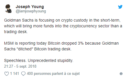 An ad ... and patterns! On Wednesday, September 5, Business Insider reported that Goldman Sachs was abandoning "the short-term" launch of its bitcoin trading office. According to the US website, it is because of the lack of regulation that the merchant bank suspends its project. This new department was announced in the press in December 2017, at the height of the excitement around Bitcoin. Last May, the New York Times had questioned the officials of this cell that should have started this summer ... but they will gnaw still little. As a result, Bitcoin prices fell by more than 12%, sometimes reaching highs on other cryptocurrencies (-20% on Ethereum). On some specialized media, one can read "Goldman Sachs would no longer believe in cryptocurrency".