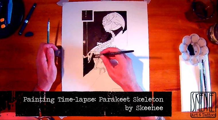 Today´s time-lapse is an ink painting of a parakeet skeleton; another painting in which I try to contrast the large black ink shapes with the colorful beak of the parakeet. Just like the hornbill, the beaks of these exotic birds provided me with a perfect contrast opportunity.