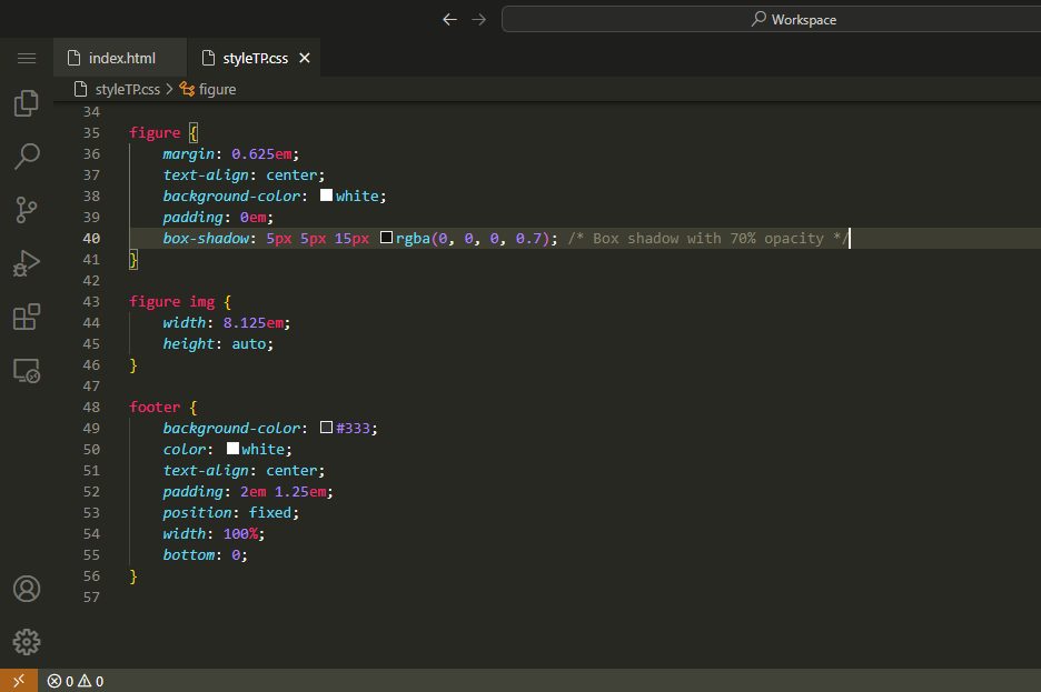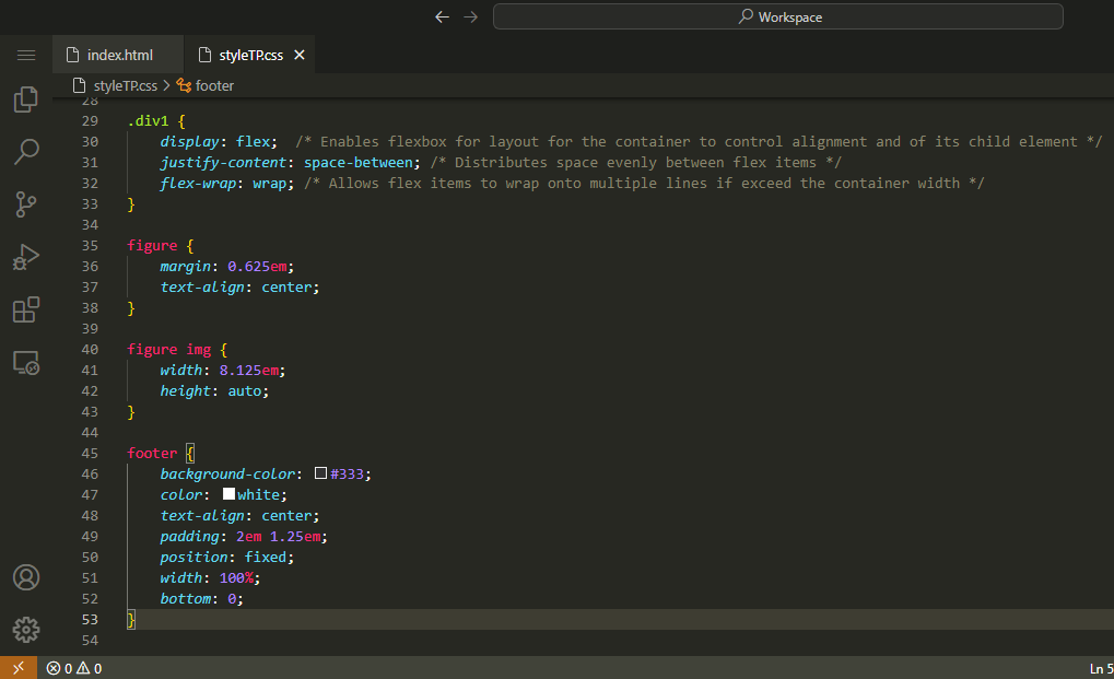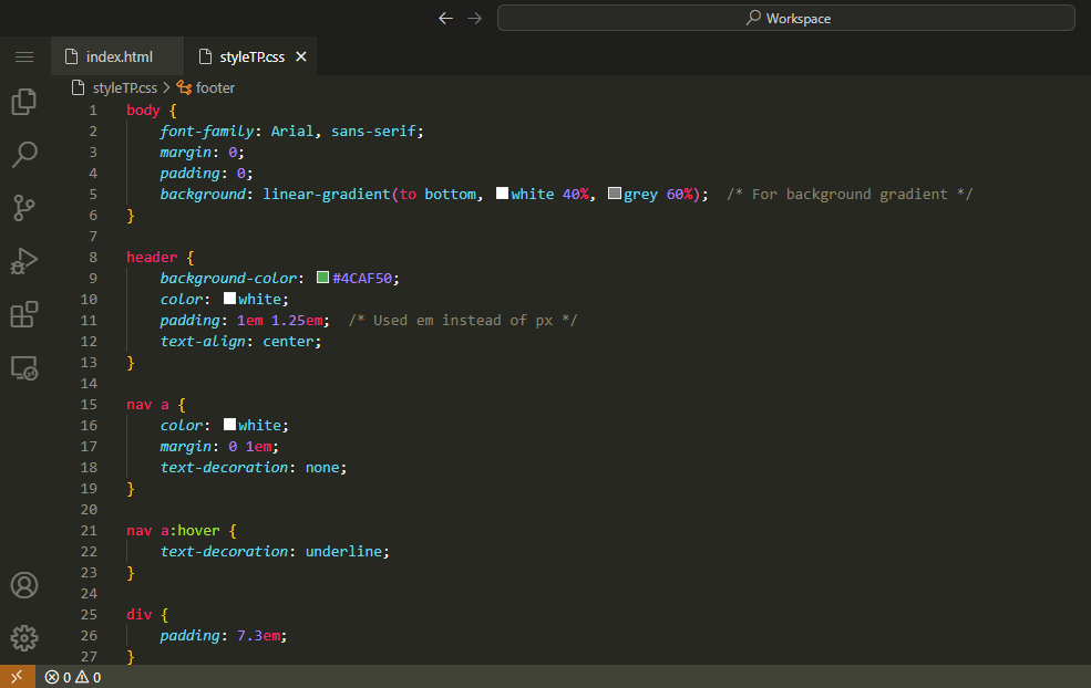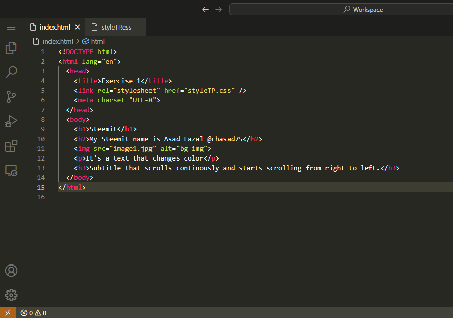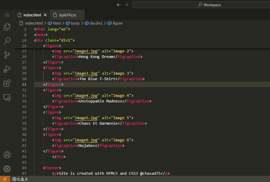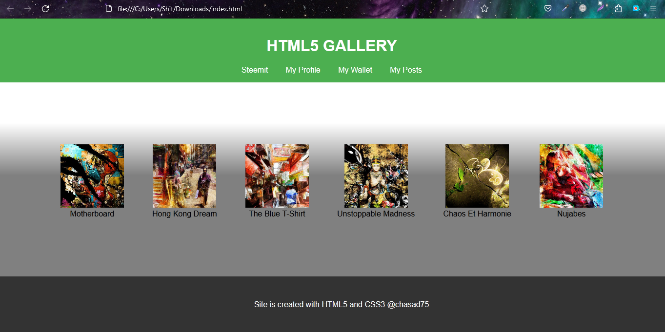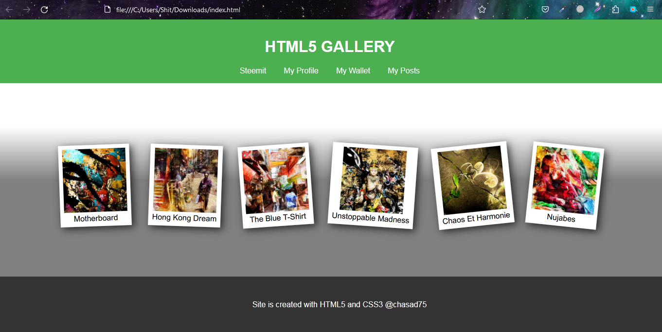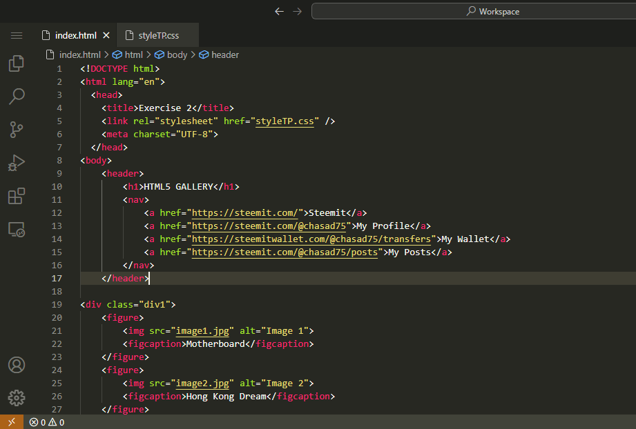 In HTML I created a basic layout with header, navbar, section, and footer. Then I added menu links and name them with my Steemit profile. I used figure inside div for images as it is said in the exercise 2 with figcaption. In last I added footer with my steemit username.