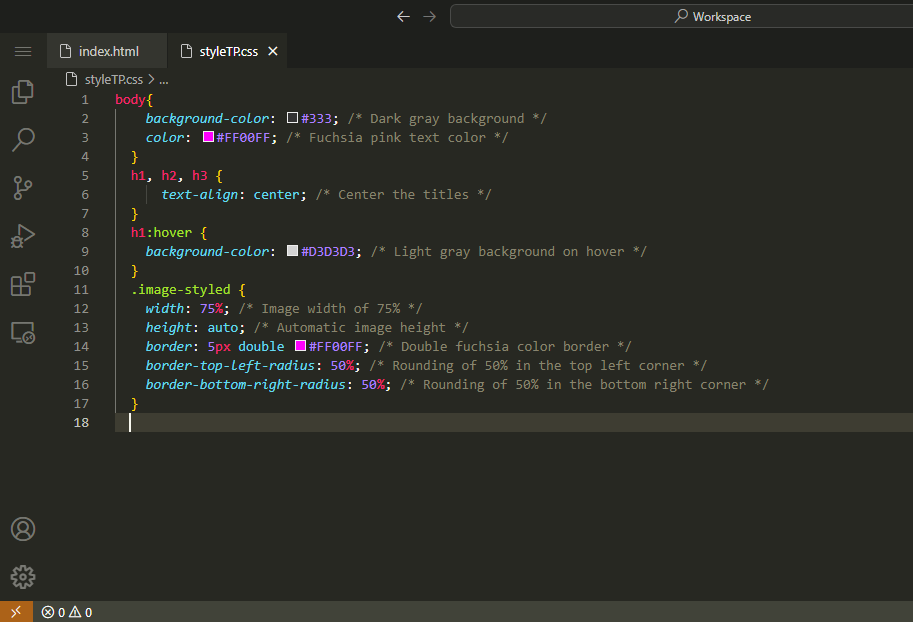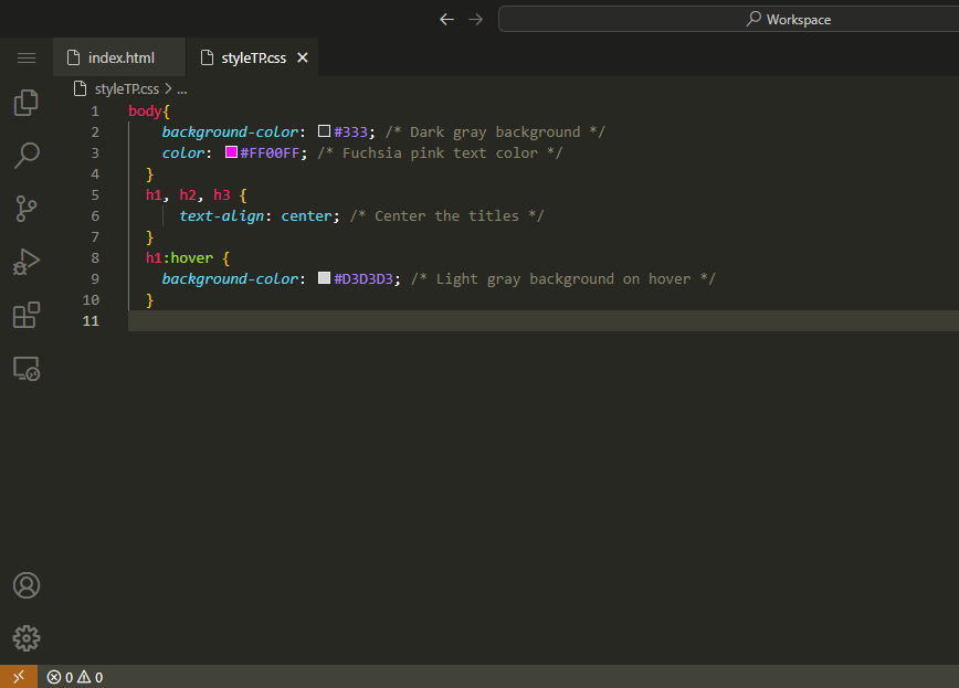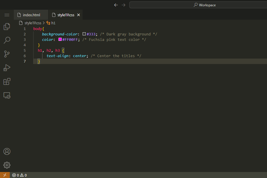 Here I applied dark gray background to entire document and fuchsia pink text color. I centered align all headings as they are the titles of the document. Why I center align all headings because in question there is written titles not title so I apply to all instead of just h1 title.