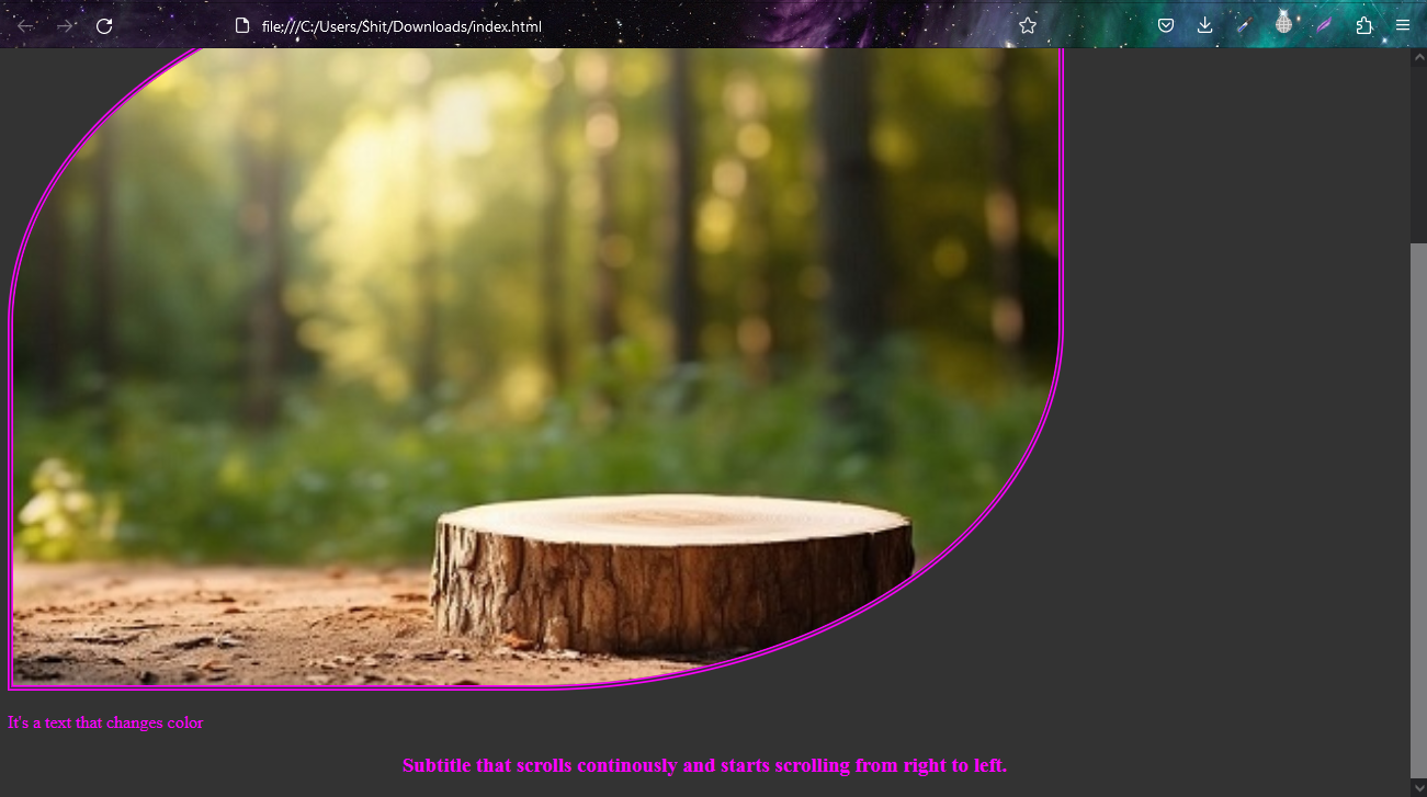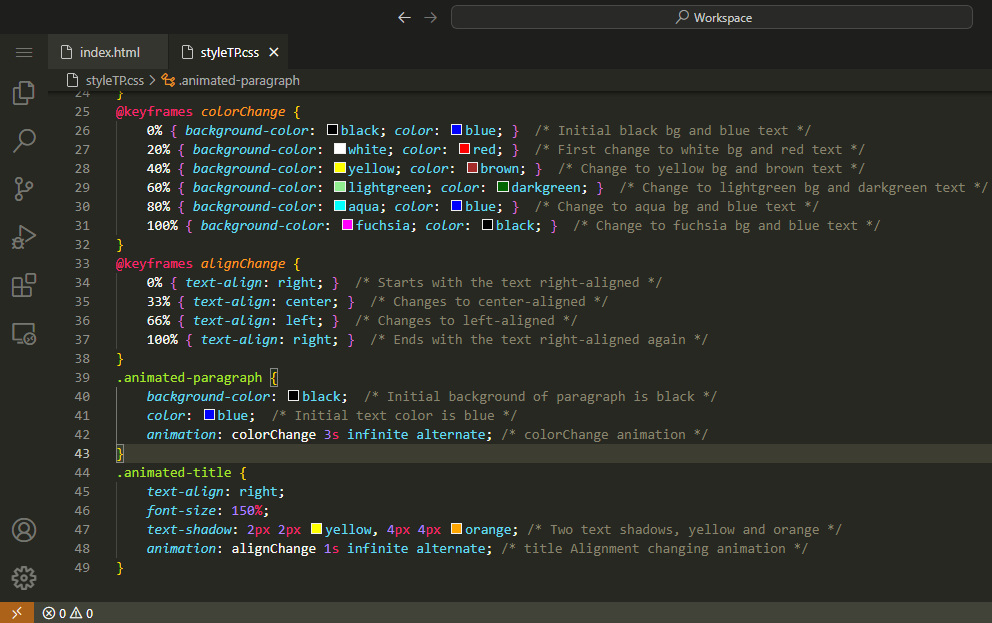 I put comments on the CSS code but let me explain a little here as well. The image styled was explained above. After that I used keyframes to control the animation sequence. I used colorChange to change the background and font colors of paragraph. After that I used alignChange in keyframe to control the sequence of title from right to center to left. In last I put text shadows yellow at 2px distance and orange at 4px distance.