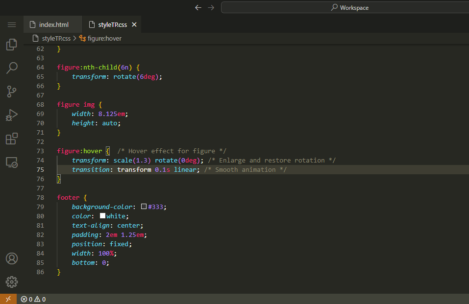 To perform the animation for smooth enlargement I used animation property: transform. You can see the addition of code in figure hover pseudo class at the end. The code is transition: transform 0.1s linear. I used 100millisecond linear animation. Please have a look at below code for better understanding.