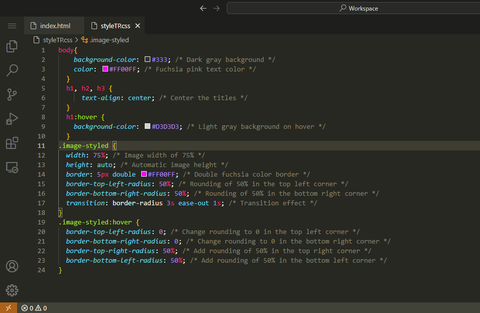 We will not change HTML because the work needs to be done in CSS. First in my class of image named image-styled, I added transition that will trigger after one second of wait and then It lasts for 3 seconds if you move mouse out of image. In hover class of image I added border radius for top left and bottom right to zero because when we move mouse to image, border will return to 0 mean no border radius.