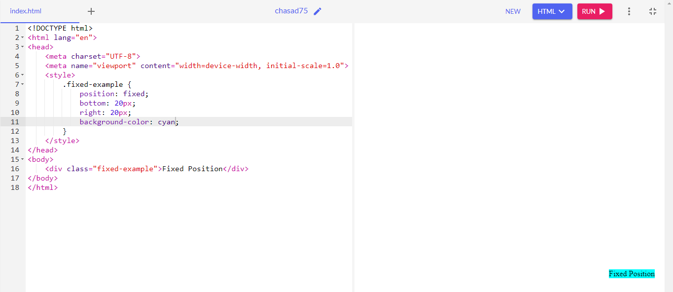 When fixed property is used, the element is positioned relative to viewport means it always stay in the same place even if page is scrolled. In webpages we fixed the sidebars or header to make them stay in their place.