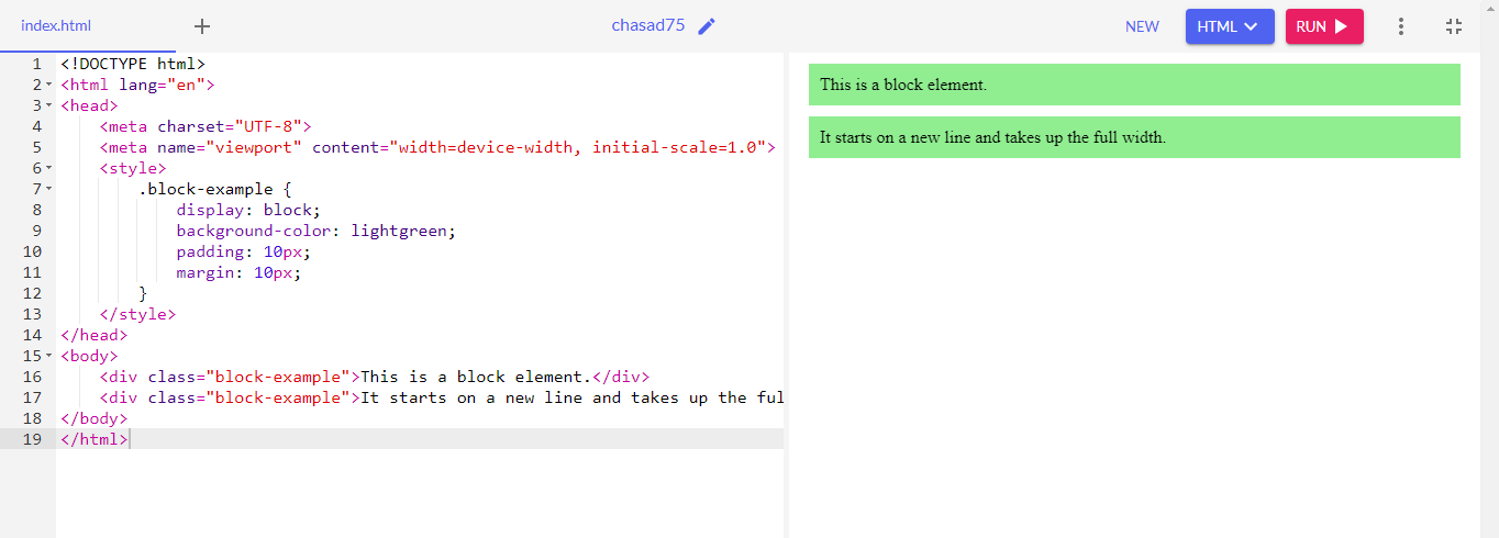 On the other hand, if I set an element to block, it will take up full width of its container and always start a new line. This means no other element can sit aside it on the same line as it covers full width of its container. They make container work in a column format one under each other. Example of block elements is < p>, < ol>, < ul>, < h1,h2...>, and < div>.