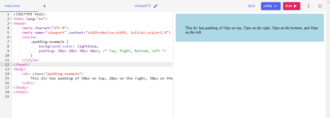 Padding is the space inside the element between the content and the border. It can be used to add space between the content and its container. If I increase padding, I will create more space inside the element making area around the content larger. It could be done with top, right, bottom and left paddings.