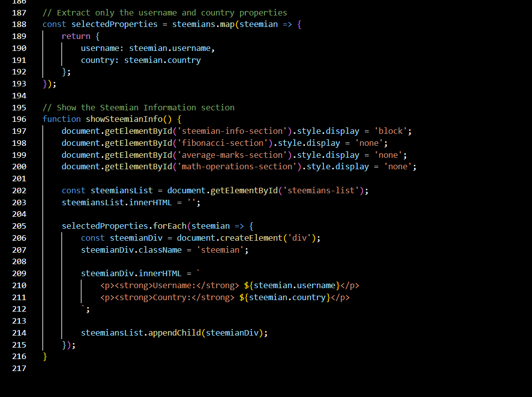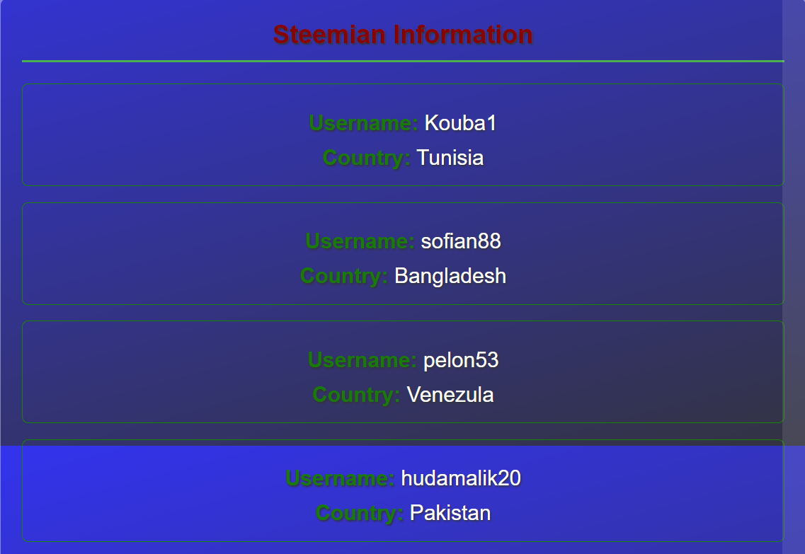 Object is the data type to store the data and these objects are stored in the arrays. Here is the code in which I have created 5 objects for different steamians and store their data in the array and the use the display function to show the username and country of the steemians...Here you can see the code.