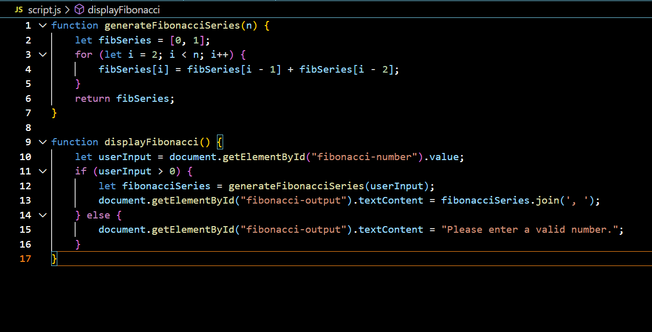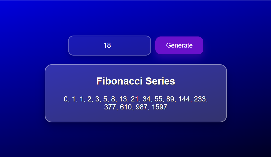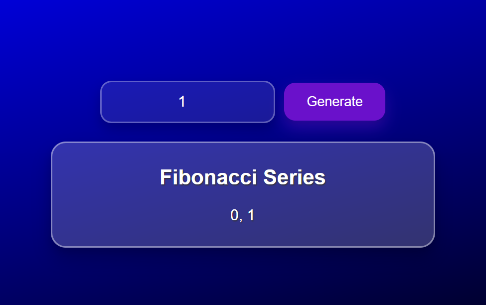 So this is the final execution of the code. First of all I have implemented the logic to appear the Fibonacci series. Secondly I have used the for loop of JavaScript to keep the operation running. In the input box we can give any of the number and then click on generate on to see the series.