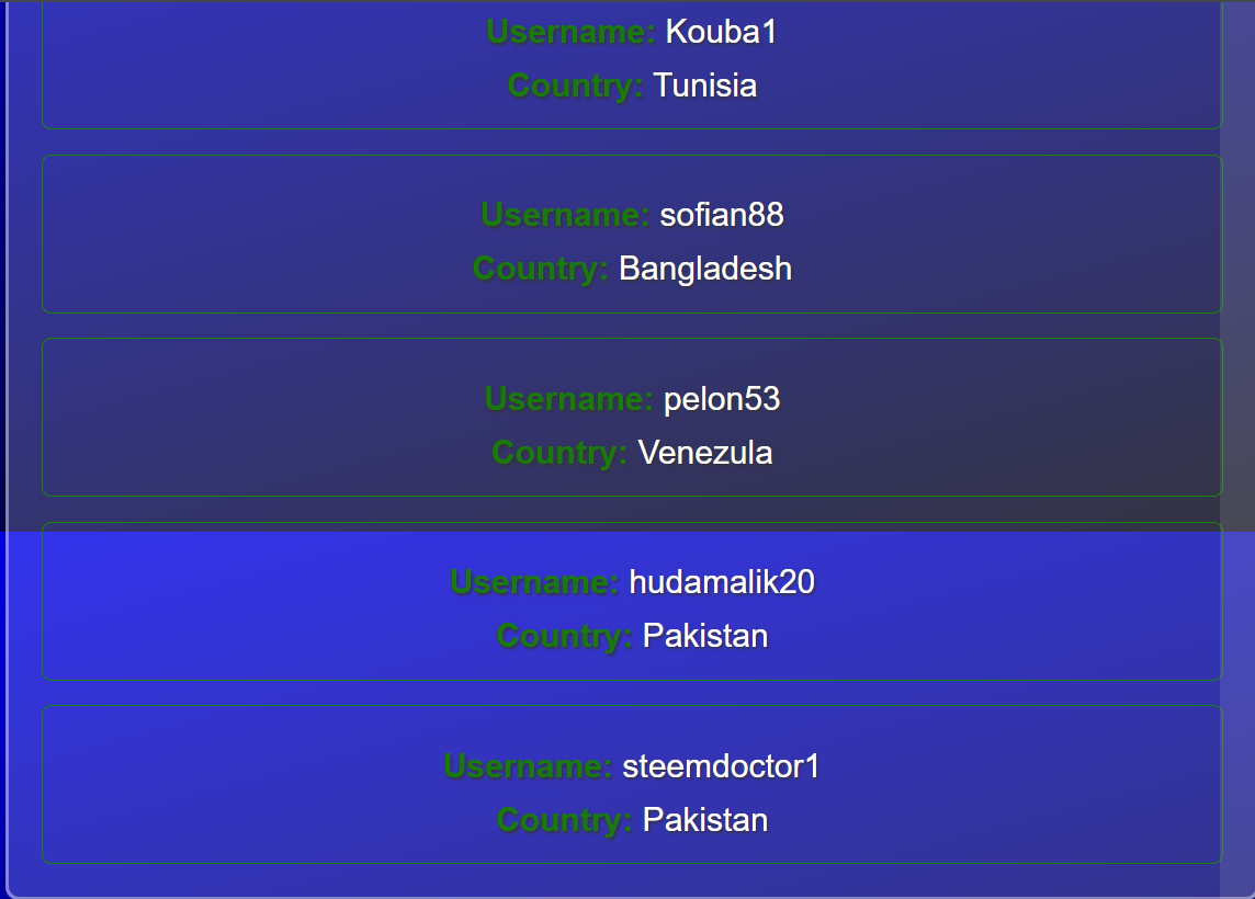 So here in output you can see the names of the steemians along with their country names. Now lets move to the next question.