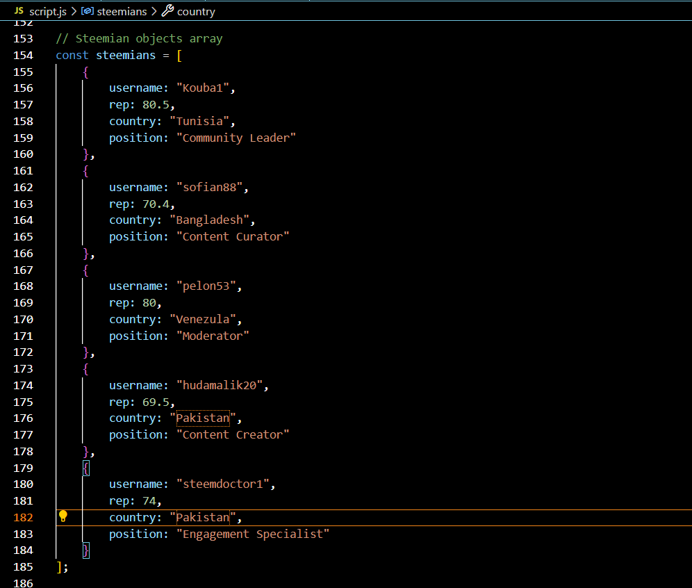 Create object for 5 steemians with username, rep, country, position held on steemit properties.