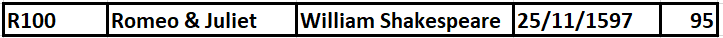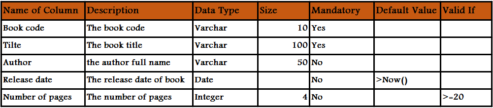 • A row (record/tuple) represents an occurrence of an object represented by the table. Example: A row in the "book" table: